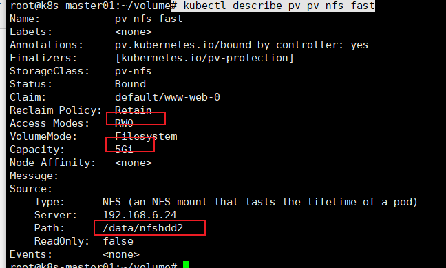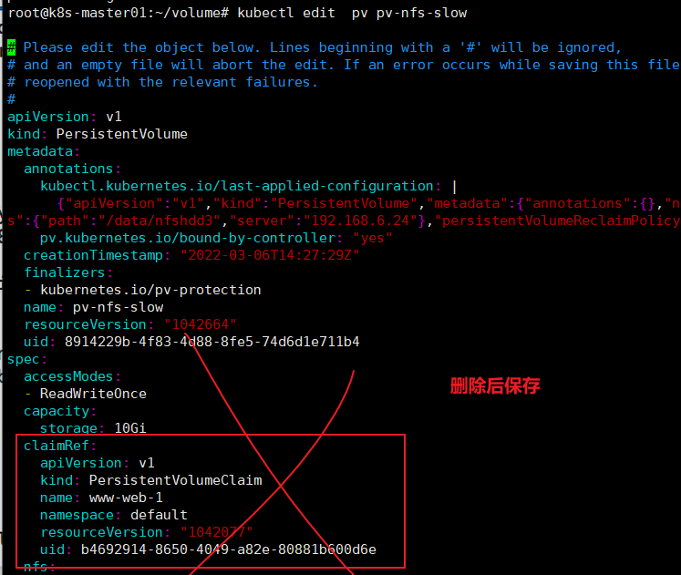 # kubectl delete pv pv-nfs-slow #删除指定名称pv