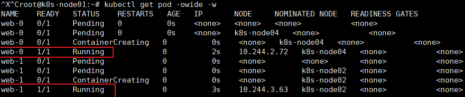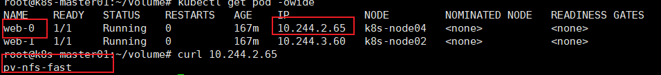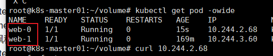 # kubectl delete pod web-0 # kubectl get pod -owide # curl 10.244.2.68