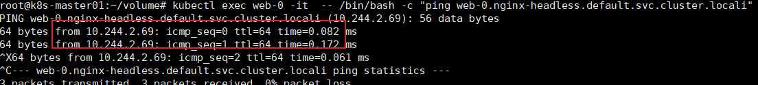 # kubectl exec web-0 -it -- /bin/bash -c "ping web-0.nginx-headless.default.svc.cluster.locali"