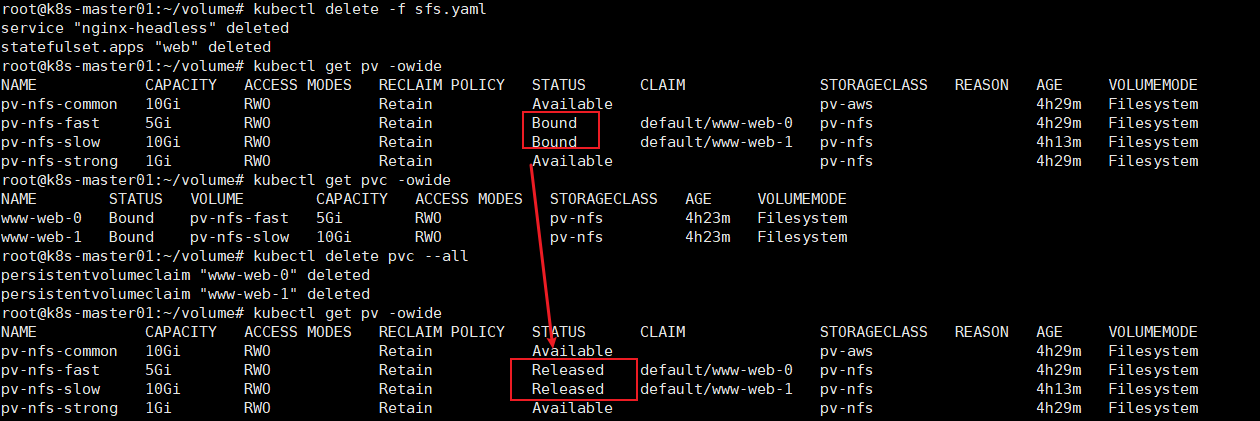 # kubectl delete -f sfs.yaml # kubectl get pv -owide # kubectl delete pvc --all # kubectl get pv -owide