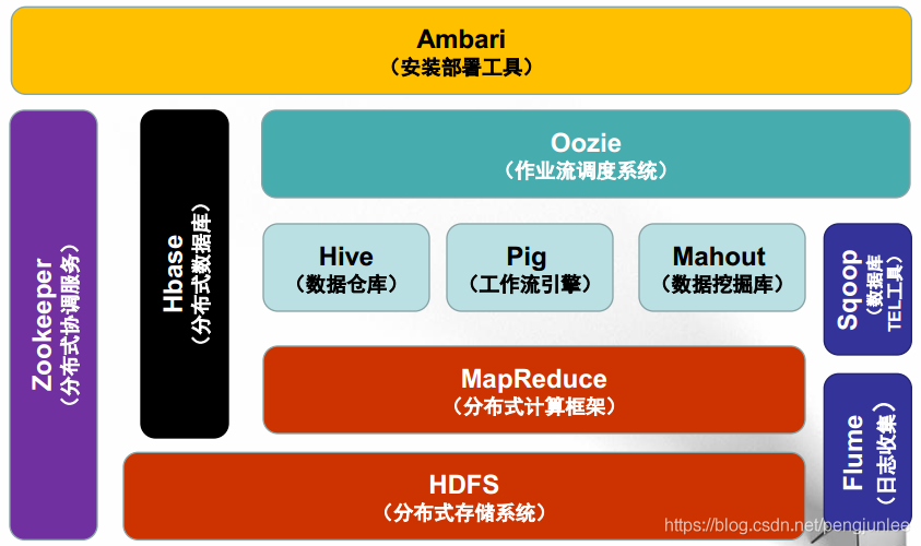 以 Hadoop2.0 为例, 包含分布式存储系统HDFS、分布式计算框架MapReduce两大核心组件,以及资源管理系统YARN(2.0之后版本才有)。