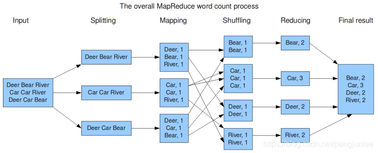 下图演示了MapReduce如何对文件中单词的出现频率进行统计。