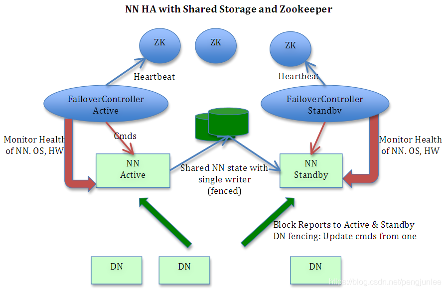 NameNode(图中 NN Active),是HDFS的守护程序。用来记录文件是如何切分成数据块的,以及这些数据块被存储到哪些DataNode节点上。