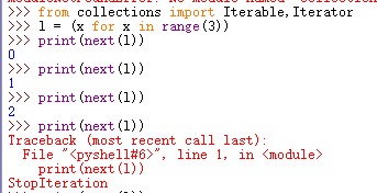 不仅可以作用于for循环,还可以被next()函数不断调用并返回下一个值,直到最后抛出StopIteration错误并无法继续返回下一个值