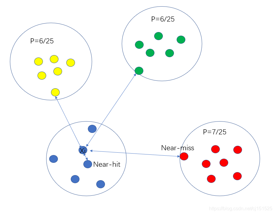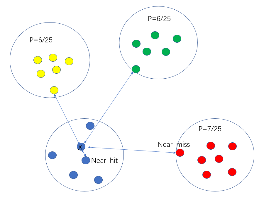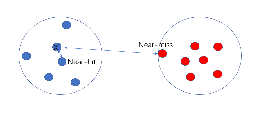 显然,Relief的关键是确定相关统计量。易知Relief算法的核心在于如何计算出该相关统计量。对于数据集中的每个样例xi,Relief首先找出与xi同类别的最近邻与不同类别的最近邻,分别称为猜中近邻(near-hit)与猜错近邻(near-miss)。
