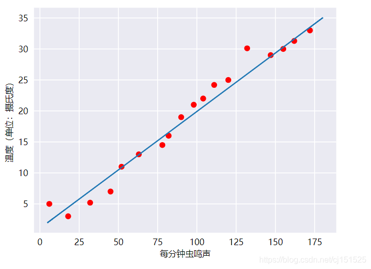 毫无疑问,此曲线图表明温度随着鸣叫声次数的增加而上升。鸣叫声与温度之间的关系是线性关系吗?是的,您可以绘制一条直线来近似地表示这种关系,如下所示: