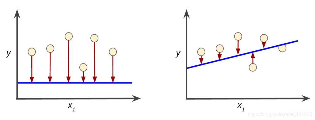 请注意,左侧曲线图中的红色箭头比右侧曲线图中的对应红色箭头长得多。显然,相较于左侧曲线图中的蓝线,右侧曲线图中的蓝线代表的是预测效果更好的模型。