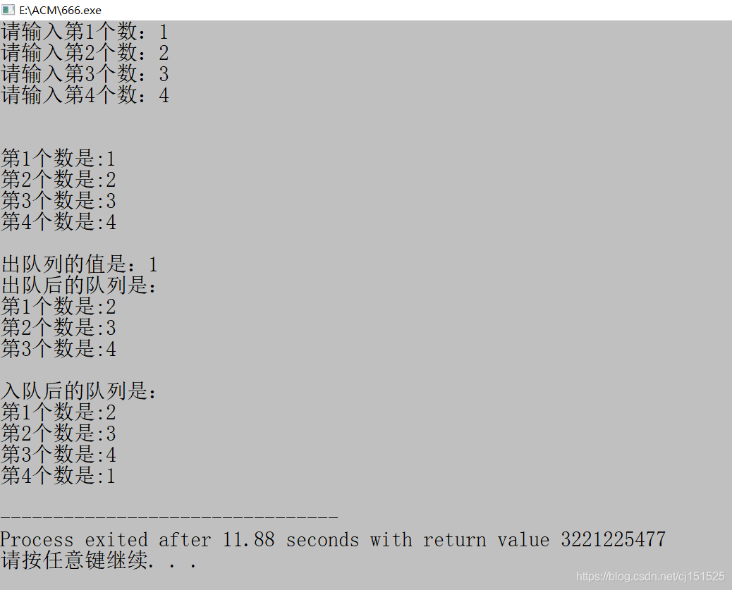 printf("\n出队列的值是:%d\n出队后的队列是:\n",item);