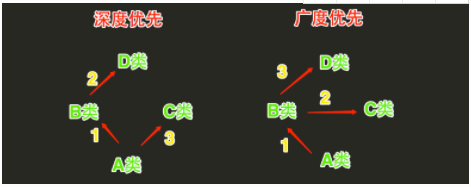 广度优先:在下图中可以直观的看到是以层级展开查找的,如果A后面还有子类E,那么第4个查找就是这个E
