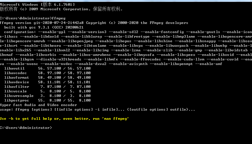 cmd 执行输入ffmpeg,如果显示
