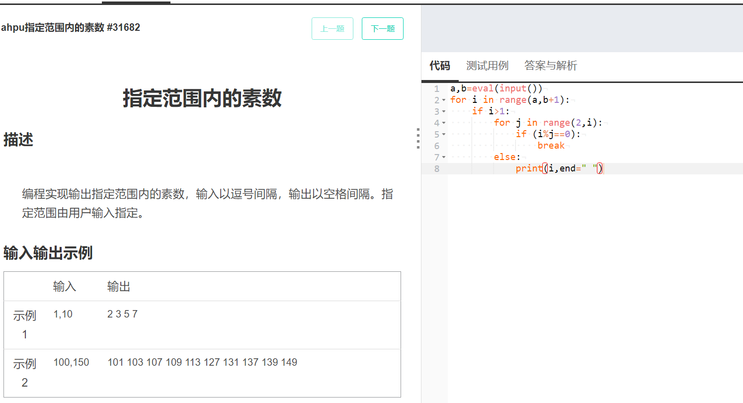 1)计算并输出指定范围内的素数
