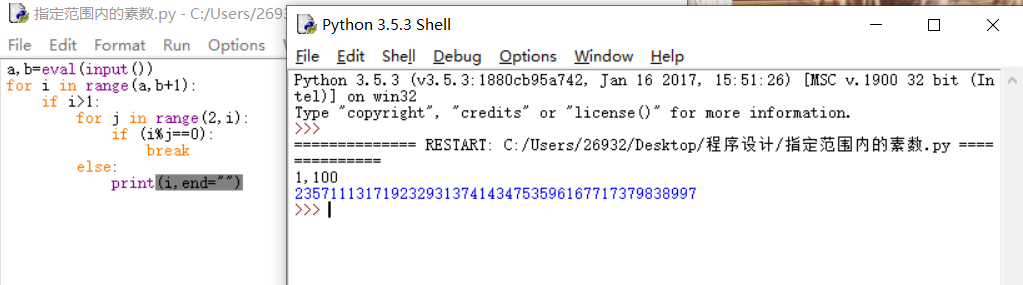 编程实现输出指定范围内的素数,输入以逗号间隔,输出以空格间隔。指定范围由用户输入指定。