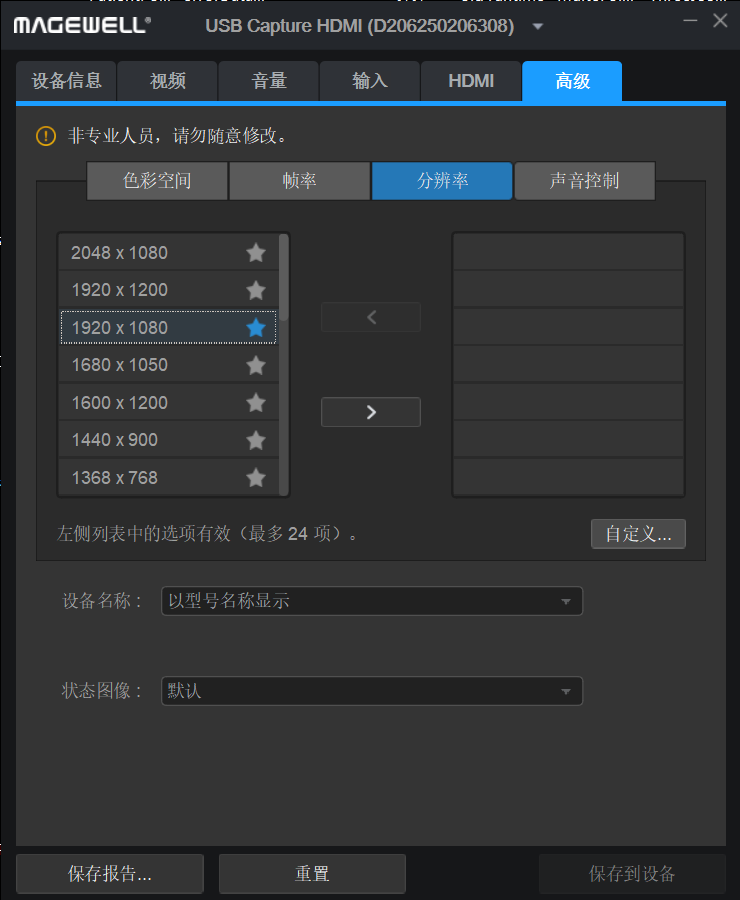 上述代码中,视频捕捉硬件的默认输出分辨率为1920*1080,若需要修改,可以在安装的Magwell上进行设置: