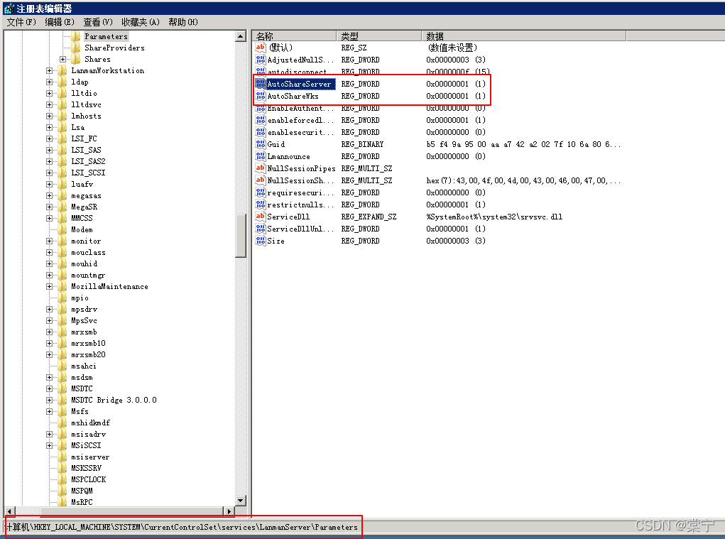 1、在运行中(或键盘按Win+R)输入regedit打开注册表,找到HKEY_LOCAL_MACHINE\SYSTEM\CurrentControlSet\services\LanmanServer\Parameters选中Parameters,在右边名称中找到AutoShareServer和AutoShareWks 项,在其右键菜单中,点击修改,将其“数值数据:”由原来的0改为1,然后点击确定。