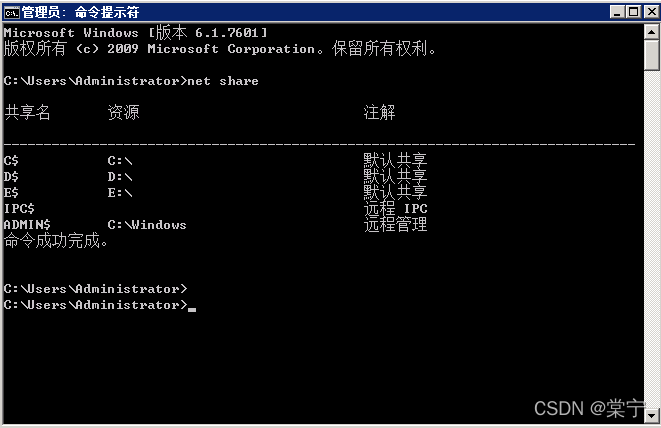 2、重新启动电脑后,通过DOS命令 net share查看默认共享情况是否正常,在共享列表中会看到ADMIN$、C$、D$ 、IPC$等默认共享了。