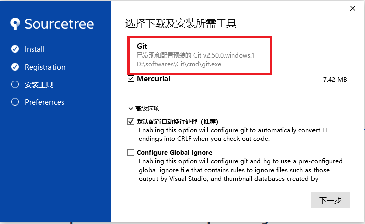 - SourceTree会自动检测已安装的Git工具,并显示安装位置