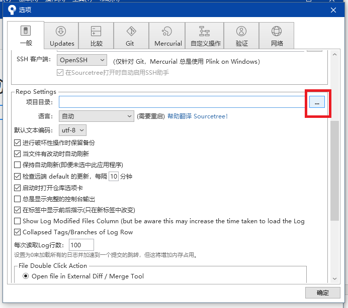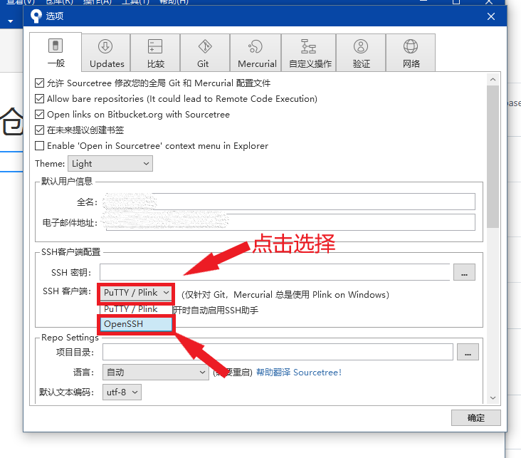 SSH客户端配置选择OpenSSH,SourceTree会自动获取本地的私钥地址,若本地有多个私钥自行选择