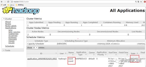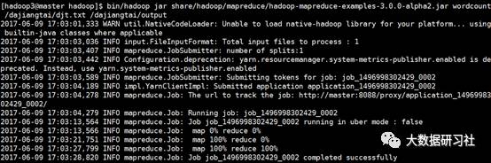 [hadoop3@master hadoop]$ bin/hadoop jar share/hadoop/mapreduce/hadoop-mapreduce-examples-3.0.0-alpha2.jar wordcount /dajiangtai/djt.txt /dajiangtai/output