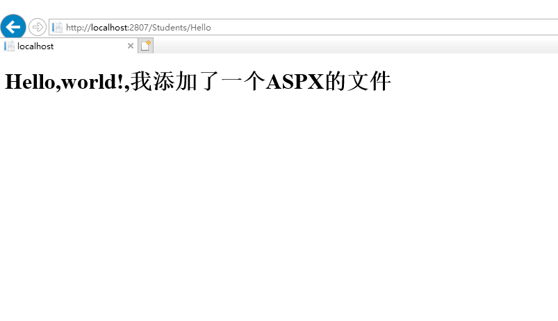 <%@ Page Language="C#" Inherits="System.Web.Mvc.ViewPage" %> <!DOCTYPE html> <html xmlns="http://www.w3.org/1999/xhtml"> <head runat="server"> <meta http-equiv="Content-Type" content="text/html; charset=utf-8"/> <title></title> </head> <body> <form id="form1" runat="server"> <div> <h1>Hello,world!,我添加了一个ASPX的文件</h1> </div> </form> </body> </html>
