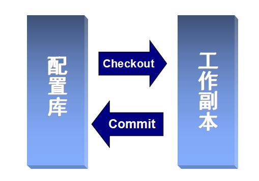 与位于中央配置库相对应的是每个人的工作空间,它是每个程序员工作的地方,程序员从配置库拿到源代码,放在本地作为工作副本,在工作副本上进行查看、修改、编译、运行、测试等操作,并把新版本的代码从这里提交回配置库库中。