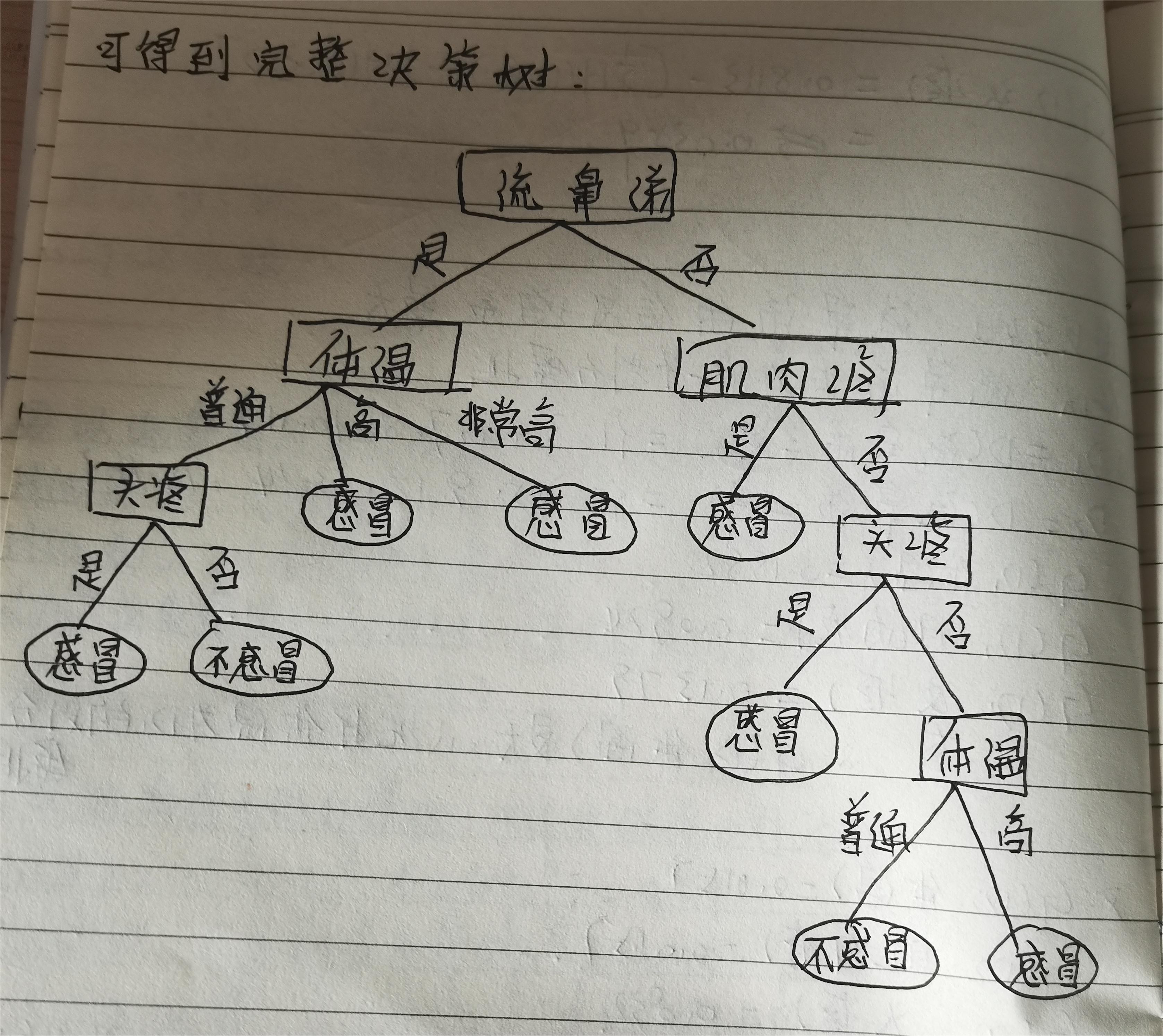 表2是一个由16个样本组成的感冒诊断训练数据集𝐷。每个样本由四个特征组成,即体温、流鼻涕、肌肉疼、头疼。其中体温特征有3个可能取值:普通、较高、非常高;流鼻涕,肌肉疼、头疼分别有两个可能取值:是、否;样本的标注值为是否感冒。试用ID3或C4.5算法通过训练数据集𝐷建立一个用于判断是否感冒的决策树。