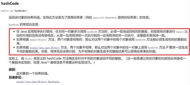 ③ 如果根据 equals(java.lang.Object) 方法,两个对象不相等,那么对这两个对象中的任一对象上调用 hashCode 方法不 要求一定生成不同的整数结果。但是,程序员应该意识到,为不相等的对象生成不同整数结果可以提高哈希表的性能。