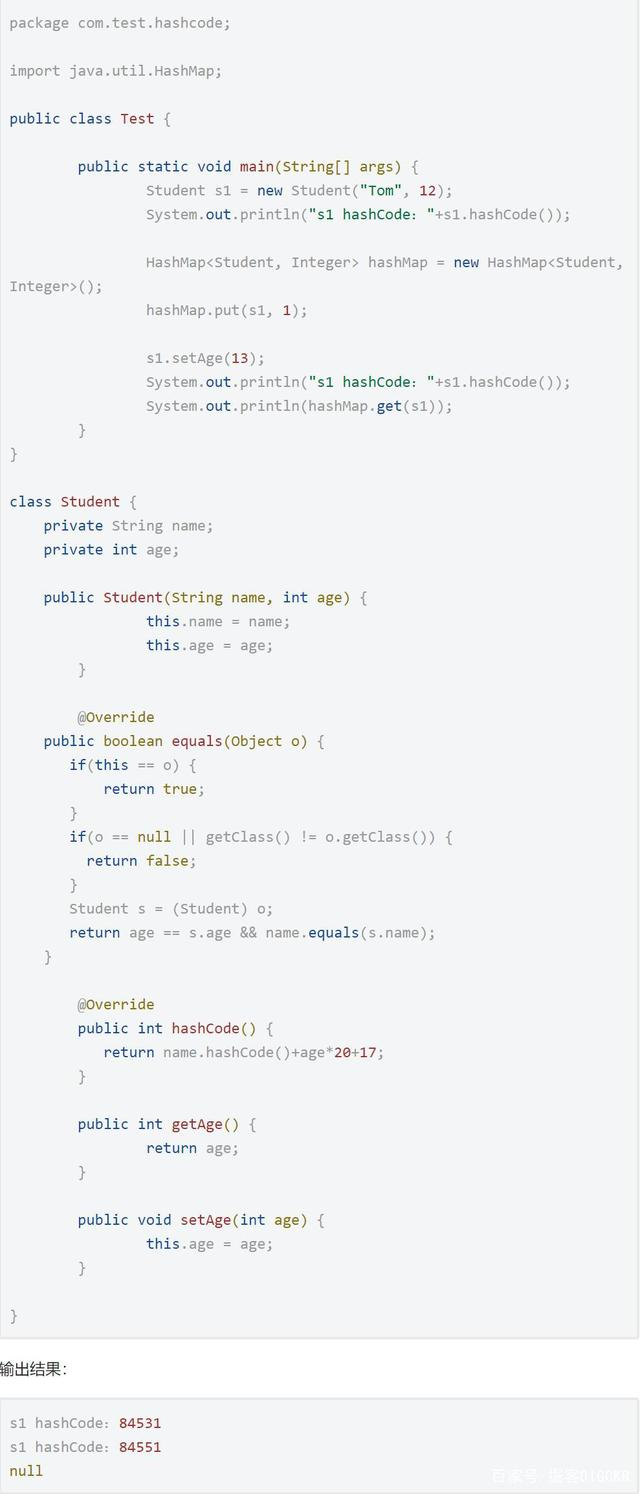 如果hashCode方法依赖于对象中易变的数据,用户就要当心了,因为此数据发生变化时,hashCode()方法就会生成一个不同的hash值。看下面例子: