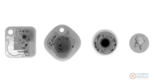首先,不论是从外形上来看,还是通过X光来查看内部的机构,都不难看出苹果AirTag的体积是最小的,内部设计最为紧凑,对于内部空间的利用率让人印象深刻。