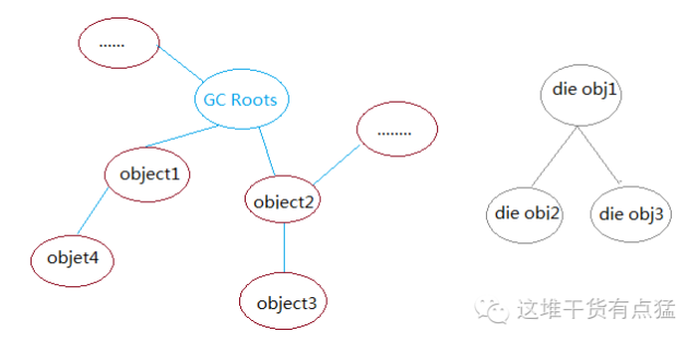 可达性分析的基本思路就是:通过将一些称为"GC Roots"的对象作为起始点,从这些节点开始搜索,搜索和该节点发生直接或者间接引用关系的对象,将这些对象以链的形式组合起来,形成一张“关系网”,又叫做引用链。最后垃圾收集器就回收一些不在这张关系网上的对象。如图: