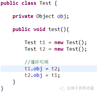 引用计数实现起来比较简单,就是给对象添加一个引用计数器,每当有一个地方引用它时就加1,引用失效时就减1,当计数器为0的时候就标记为可回收。这种判断效率很高,但是很多主流的虚拟机并没有采用这种方法,主要是因为它很难解决几个对象之间循环引用的问题,向下图这个例子这样发生循环引用。虽然不怎么用了,但还是值得我们学习!