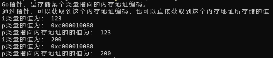 1 package main 2 3 import "fmt" 4 5 func main() { 6 fmt.Println("Go指针,是存储某个变量指向的内存地址编码。") 7 fmt.Println("通过指针,可以获取到这个内存地址编码,也可以直接获取到这个内存地址所存储的值") 8 var i int = 123 9 // 申明和使用指针 *int表示当前变量类型为int类型的指针,&符号表示获取其后紧跟的变量的内存地址 10 var p *int = &i 11 fmt.Println("i变量的值为:", i) 12 // 获取指针的值 获取某个指针类型指向内存地址存储的值,使用表达式: *指针变量名 13 fmt.Println("p变量的值为:", p) 14 fmt.Println("p变量指向内存地址的的值为:", *p) 15 i = 200 16 fmt.Println("i变量的值为:", i) 17 fmt.Println("p变量的值为:", p) 18 fmt.Println("p变量指向内存地址的的值为:", *p) 19 20 }