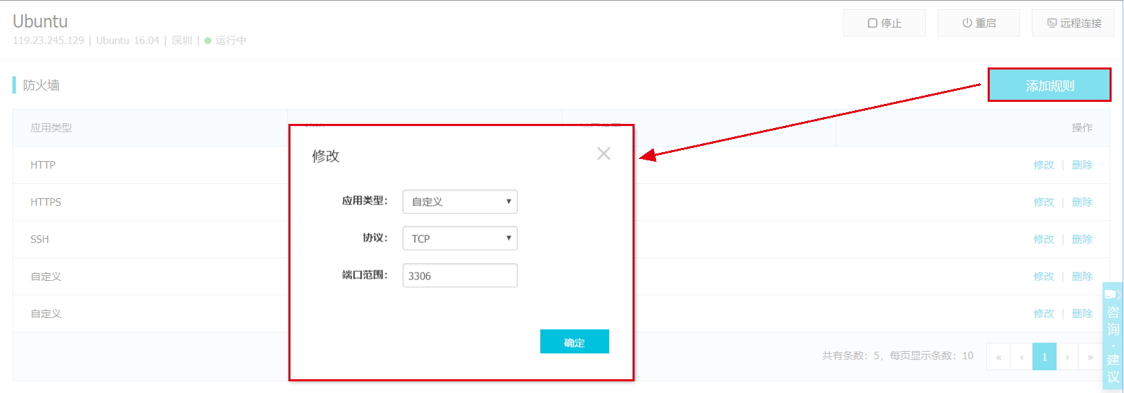 已经开放远程连接了,但对于服务器,还要开放端口,才可以连接。默认端口是3306,在阿里云防火墙添加端口: