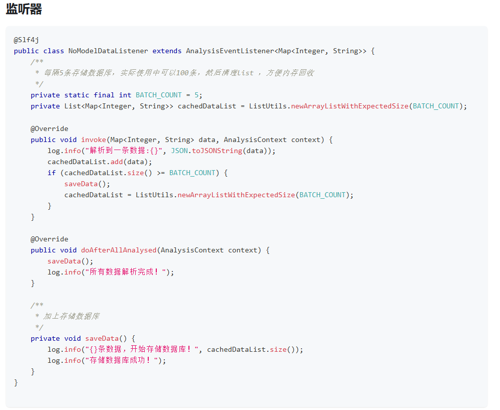 代码EasyExcel.read(fileName, new NoModelDataListener()).sheet().doRead()会不断调用invoke方法去读取excel的每一行数据,当行数据大于等于BATCH_COUNT时就会调用saveData方法来保存数据,当读完excel所有行时会调用doAfterAllAnalysed方法。