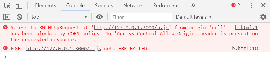 <!DOCTYPE html> <html lang="en"> <head> <meta charset="UTF-8"> <title>jsonp</title> </head> <body> <script> var xhr = new XMLHttpRequest() xhr.open('get', 'http://127.0.0.1:3000/a.js') xhr.onreadystatechange = function () { if (xhr.readyState === 4 && xhr.status === 200) {