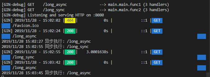 1 package main 2 3 import ( 4 "log" 5 "time" 6 7 "github.com/gin-gonic/gin" 8 ) 9 10 func main() { 11 r := gin.Default() 12 13 r.GET("/long_async", func(c *gin.Context) { 14 copyContext := c.Copy() 15 16 go func() { 17 time.Sleep(3 * time.Second) 18 log.Println("异步执行: " + copyContext.Request.URL.Path) 19 }() 20 }) 21 //同步 22 r.GET("long_sync", func(c *gin.Context) { 23 time.Sleep(3 * time.Second) 24 log.Println("同步执行: " + c.Request.URL.Path) 25 }) 26 r.Run(":8080") 27 }