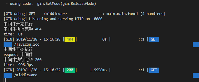 1 package main 2 3 import ( 4 "fmt" 5 "time" 6 7 "github.com/gin-gonic/gin" 8 ) 9 10 func MiddleWare() gin.HandlerFunc { 11 return func(c *gin.Context) { 12 t := time.Now() 13 fmt.Println("中间件开始执行") 14 c.Set("request", "中间件") 15 c.Next() 16 status := c.Writer.Status() 17 fmt.Println("中间件执行完毕", status) 18 19 t2 := time.Since(t) 20 fmt.Println("time: ", t2) 21 } 22 } 23 24 func main() { 25 r := gin.Default() 26 //注册中间件 27 r.Use(MiddleWare()) 28 { 29 r.GET("/middleware", func(c *gin.Context) { 30 req, _ := c.Get("request") 31 fmt.Println("request", req) 32 //页面接收 33 c.JSON(200, gin.H{ 34 "request": req, 35 }) 36 }) 37 } 38 39 r.Run(":8080") 40 }