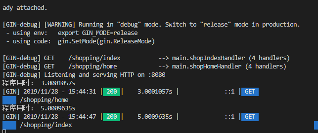 1 package main 2 3 import ( 4 "fmt" 5 "time" 6 7 "github.com/gin-gonic/gin" 8 ) 9 10 func mytime(c *gin.Context) { 11 start := time.Now() 12 c.Next() 13 14 since := time.Since(start) 15 fmt.Println("程序用时:", since) 16 } 17 18 func main() { 19 r := gin.Default() 20 r.Use(mytime) 21 shoppingGroup := r.Group("/shopping") 22 { 23 shoppingGroup.GET("/index", shopIndexHandler) 24 shoppingGroup.GET("/home", shopHomeHandler) 25 } 26 27 r.Run(":8080") 28 } 29 30 func shopIndexHandler(c *gin.Context) { 31 time.Sleep(5 * time.Second) 32 } 33 34 func shopHomeHandler(c *gin.Context) { 35 time.Sleep(3 * time.Second) 36 }
