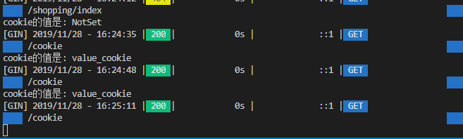 1 package main 2 3 import ( 4 "fmt" 5 6 "github.com/gin-gonic/gin" 7 ) 8 9 func main() { 10 r := gin.Default() 11 r.GET("cookie", func(c *gin.Context) { 12 cookie, err := c.Cookie("key_cookie") 13 if err != nil { 14 cookie = "NotSet" 15 c.SetCookie("key_cookie", "value_cookie", 60, "/", 16 "localhost", false, true) 17 } 18 fmt.Printf("cookie的值是: %s\n", cookie) 19 }) 20 21 r.Run(":8080") 22 }