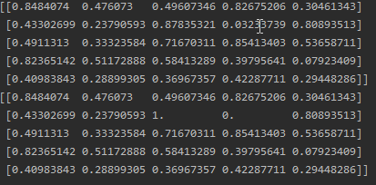 import numpy as np a=np.random.rand(5,5) #随机创建一个五行五列的数组; print(a) a[a==a.max()]=1 #将数组中的最大元素赋值为1; a[a==a.min()]=0 #将数组中的最小元素赋值为0; print(a)