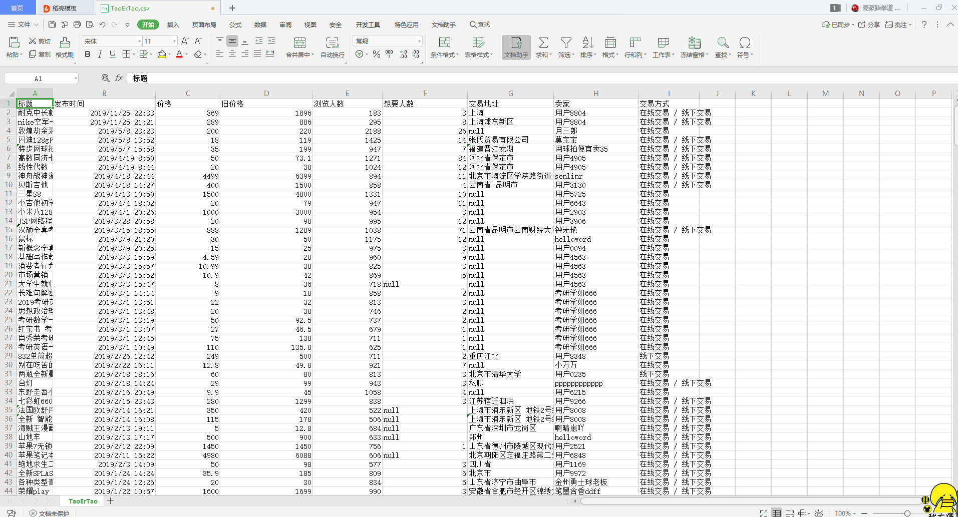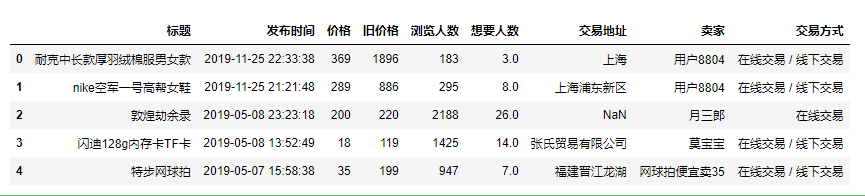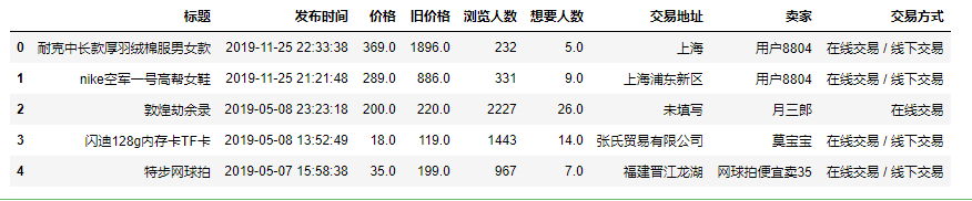 标题、发布时间、价格、旧价格、浏览人数、想要人数、交易地址、卖家、交易方式