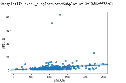 1 #获取浏览人数与想要人数之间的关系 2 sns.regplot(taoertao["浏览人数"],taoertao["想要人数"])