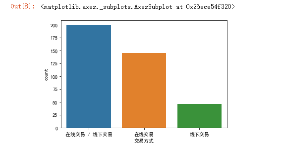 #使用柱状图查看淘二淘上商品的交易方式 import seaborn as sns import matplotlib.pyplot as plt plt.rcParams['font.sans-serif']=['SimHei'] plt.rcParams['axes.unicode_minus'] = False sns.countplot(taoertao['交易方式'])