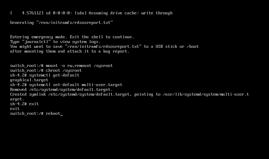[root@localhost~]# cat /etc/inittab # inittab is no longer used when using systemd. # # ADDING CONFIGURATION HERE WILL HAVE NO EFFECT ON YOUR SYSTEM. # # Ctrl-Alt-Delete is handled by /usr/lib/systemd/system/ctrl-alt-del.target # # systemd uses 'targets' instead of runlevels. By default, there are two main targets: # # multi-user.target: analogous to runlevel 3 # graphical.target: analogous to runlevel 5 # # To view current default target, run: # systemctl get-default # # To set a default target, run: # systemctl set-default TARGET.target-