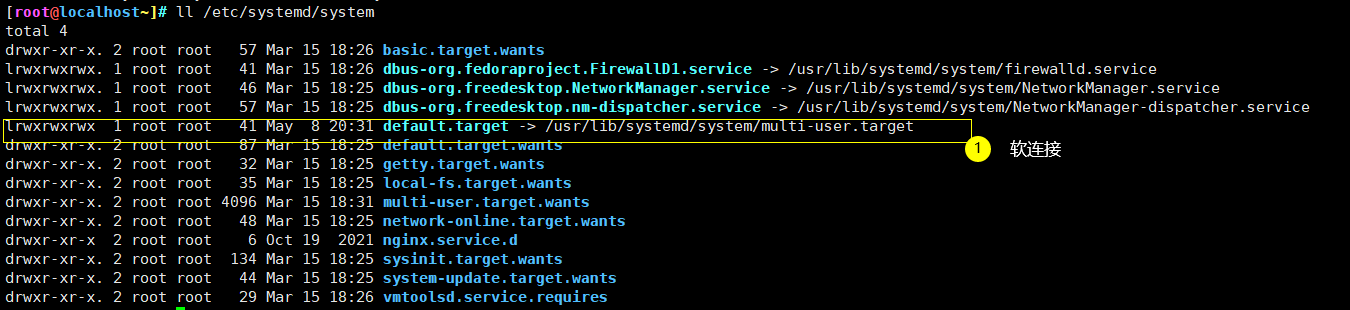 [root@localhost~]# systemctl list-unit-files [root@localhost~]# ll /etc/systemd/system/multi-user.target.wants/ -