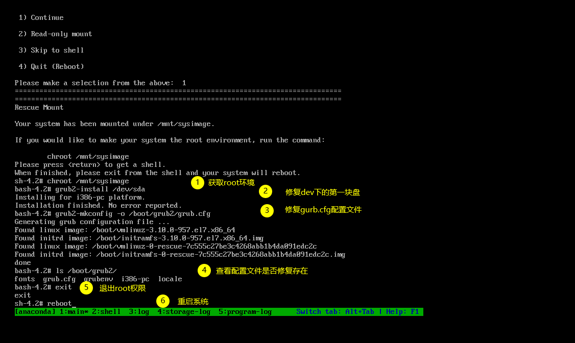 # 1.获取root的环境(root权限) chroot /mnt/sysimage # 2.修复扇区 grub2-install /dev/sda # 3. 重置grub.cfg配置文件 grub2-mkconfig -o /boot/grub2/grub.cfg # 4.退出root环境 exit # 5.重启 reboot # 如下图:![]()