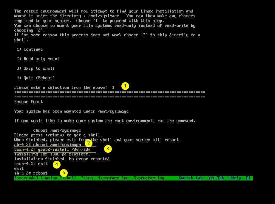 # 获取root的环境(root权限) chroot /mnt/sysimage # 修复扇区 grub2-install /dev/sda # 退出root环境 exit # 重启 reboot![]()