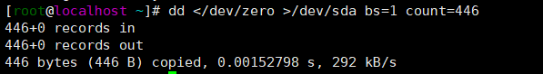 # 破坏硬盘的前446个字节,模拟MBR引导损坏,会发现重启无法启动系统 dd </dev/zero >/dev/sda bs=1 count=446 [root@localhost ~]# dd </dev/zero >/dev/sda bs=1 count=446![]()