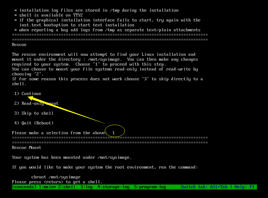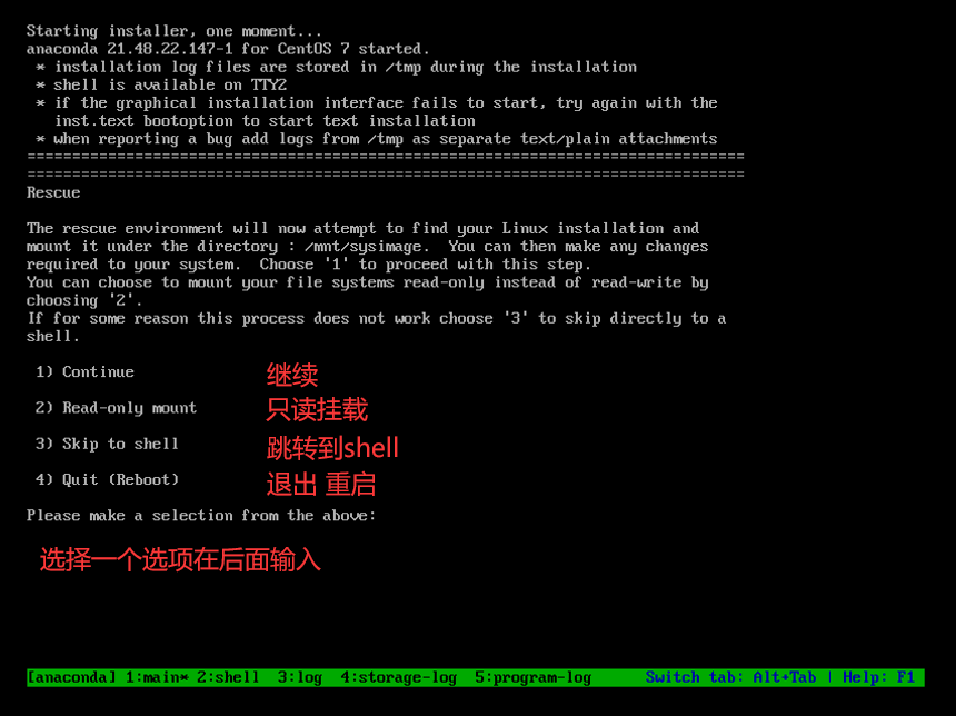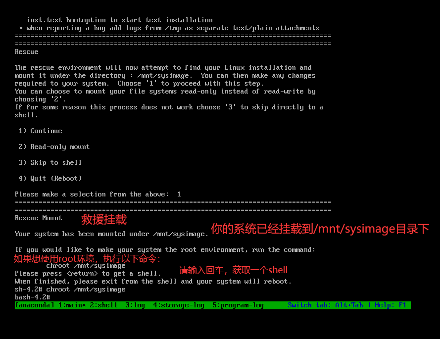 # 1.先输入回车 # 2.获取root的环境(root权限) chroot /mnt/sysimage -