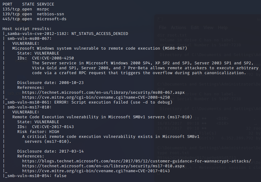 2、利用nmap脚本扫描一下端口可能有的漏洞:nmap -p 135,139,445 --script=vuln -v 10.10.10.4