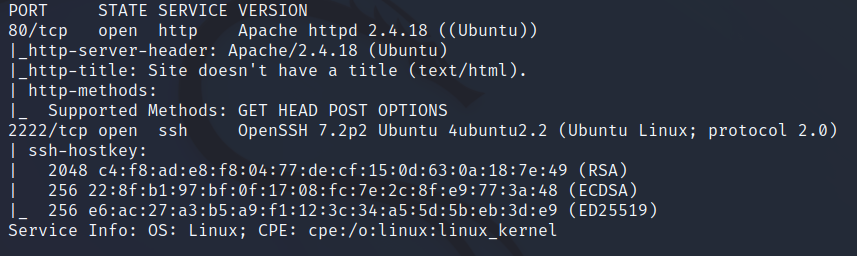 发现开了80和2222端口,80端口上是apache 2.4.18版本,2222是ssh端口;
